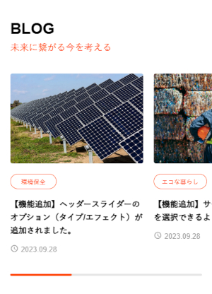 トップページのブログ一覧はカルーセル仕様になっており、横スクロールで表示されます。横スクロールを解除し縦に表示する場合はCSSを調整してください。
